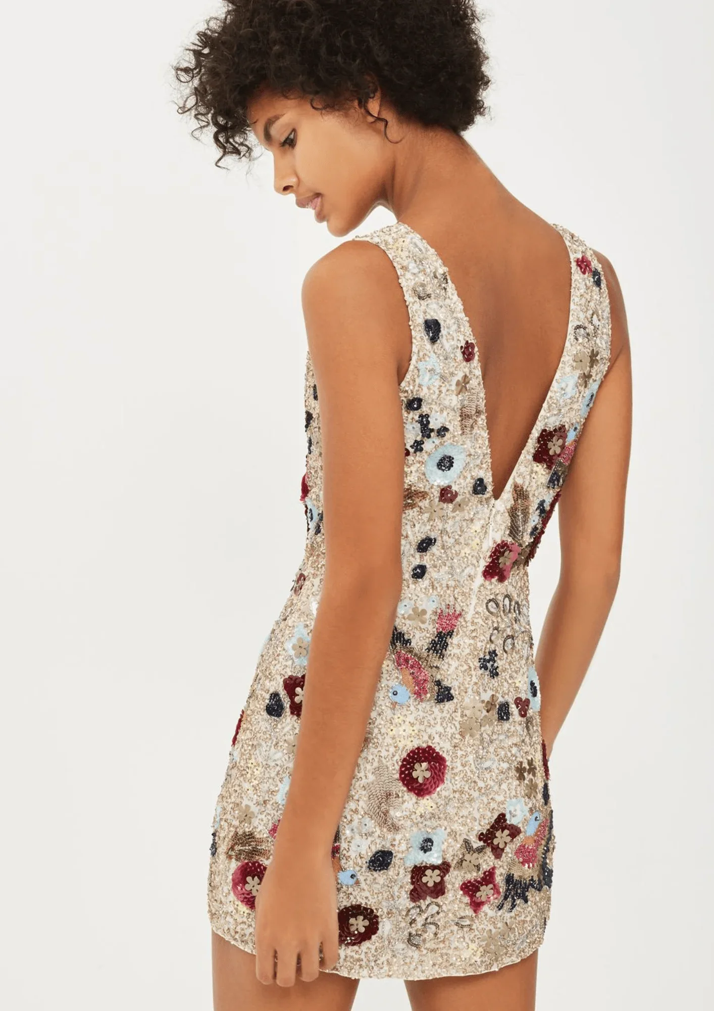 BEIGE SEQUIN PLUNGE MINI DRESS